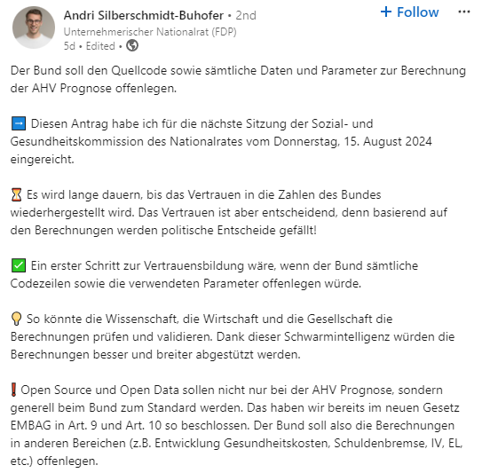 Die BSV hat angekündigt, dass es zwei Forschungsinstitute damit beauftragt hat, unabhängige Modelle zu entwickeln, um die korrigierten Werte zu validieren. Das scheint mir ein guter erster Schritt zu sein. Die Veröffentlichung des Codes sollte aber zwingend auch noch erfolgen, sodass sich alle Interessierten selbst ein Bild machen können. Auch wenn nicht jede Bürgerin und jeder Bürger die Expertise für solche Berechnungen besitzt, so gibt es diese Leute zweifelsohne. Und gerade im Bereich der AHV, wo die Meinungen stark auseinander gehen und jede Seite glaubt „recht“ zu haben, sind verlässliche Zahlen, die sich sogar noch überprüfen lassen, unersetzbar.